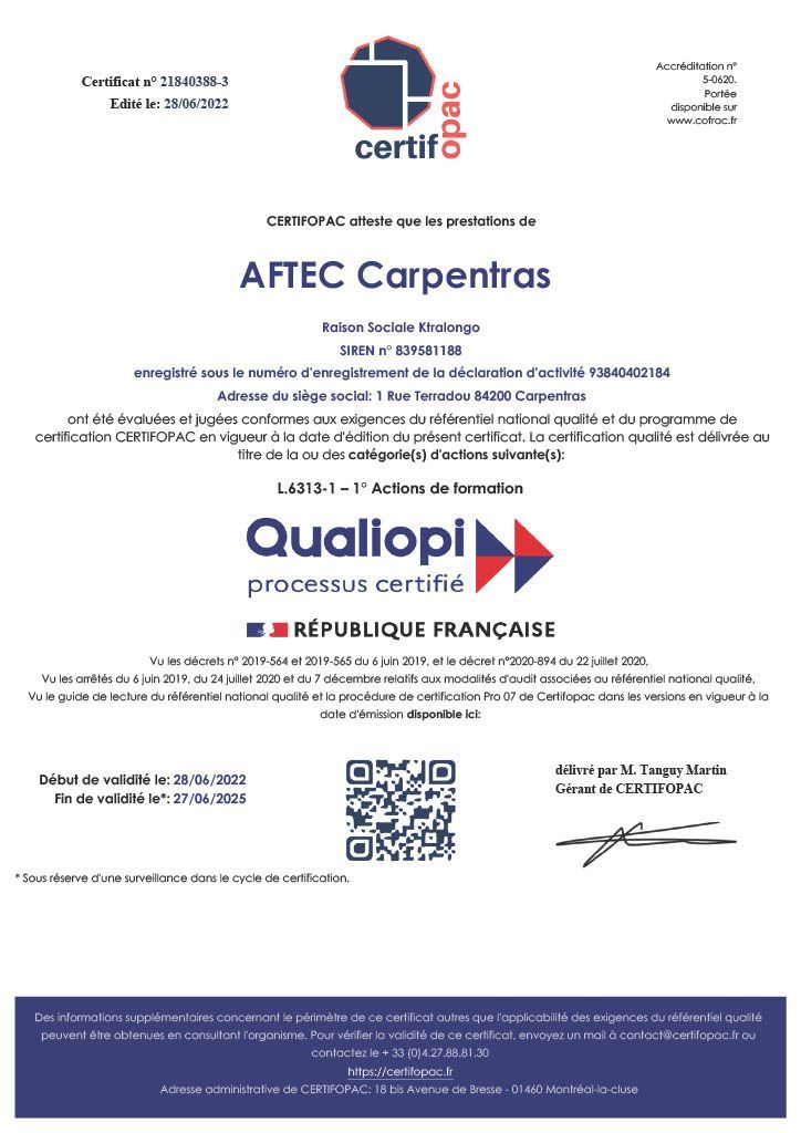 AFTEC Carpentras est un organisme de formation enregistré sous le numéro : 93840402184 auprès de la Dreets Provence-Alpes-Côte d'Azur. Cet enregistrement ne vaut pas agrément de l'Etat